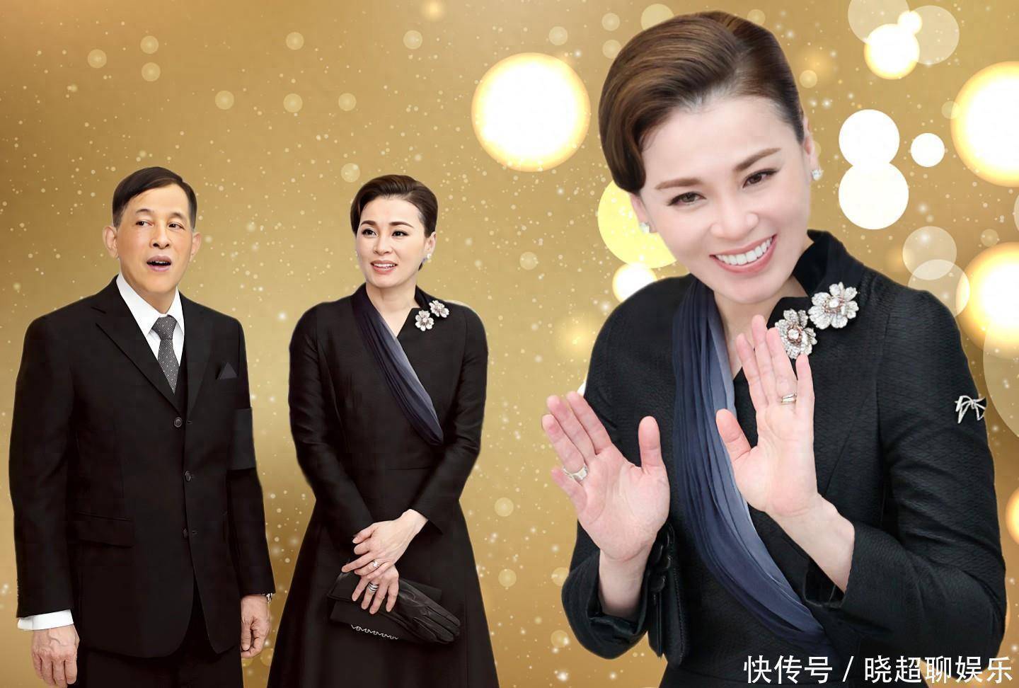 苏提达王后这次亮相简直美出新高度啦!她身着一袭黑色礼服,那前襟点缀着的灰色丝绸,就像夜空中闪烁的星辰,低调又奢华。领口处的花卉胸针,精致得不像话,为整体造型添了几分柔美。